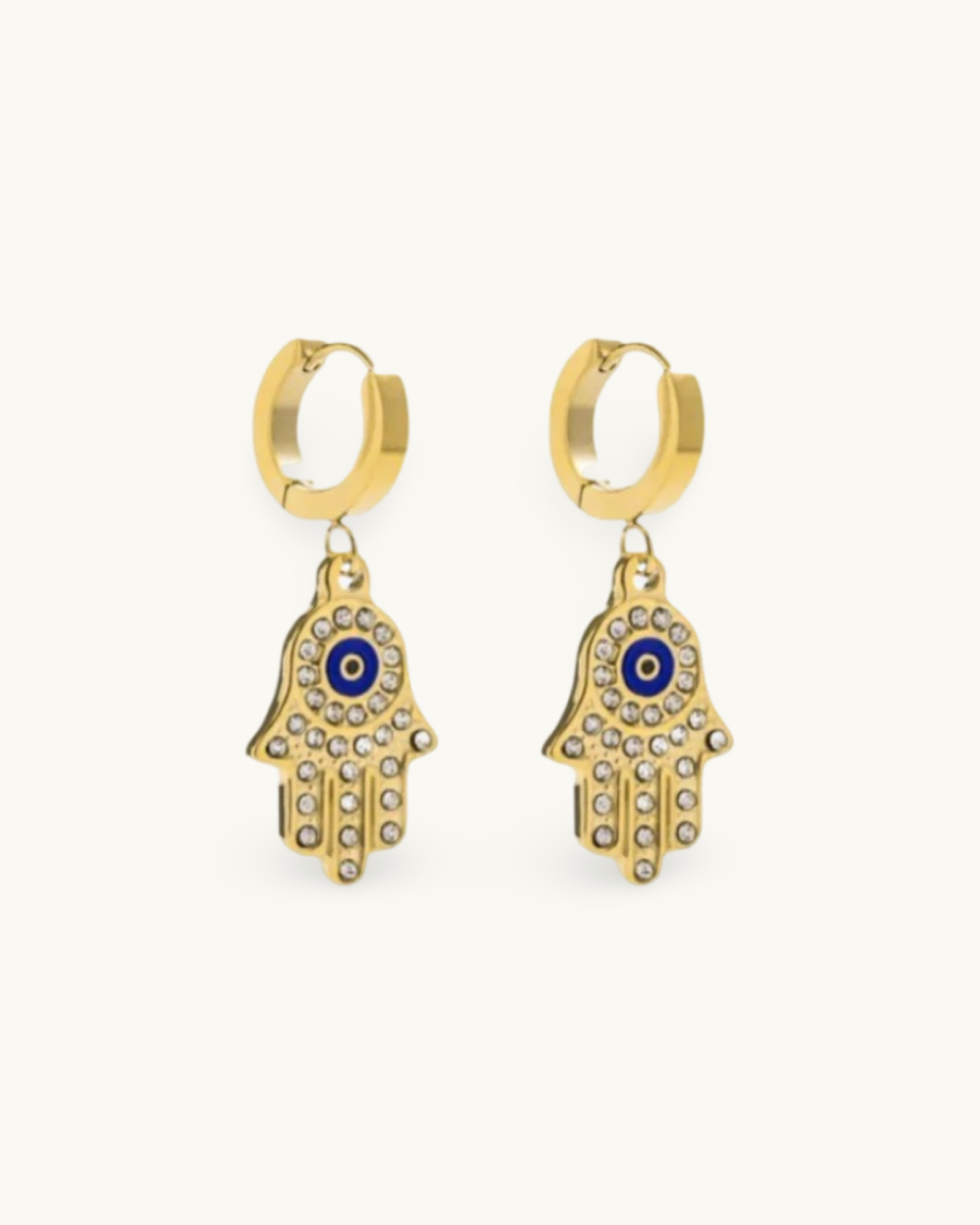 Rhea | Radiant blue eye hamza hand design earrings. Also available in a necklace to create a perfect jewellery set.