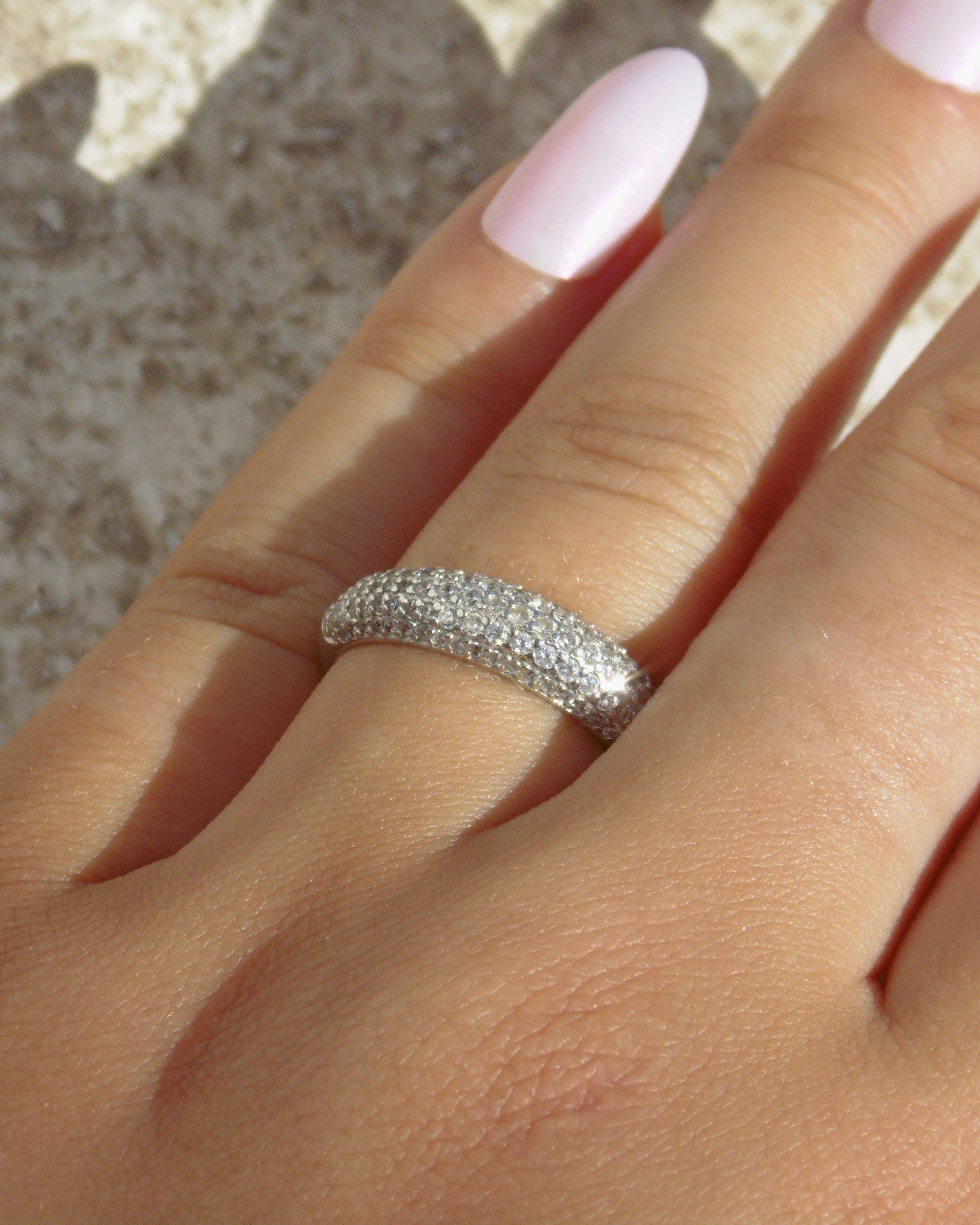 BROOKLYN | The Brooklyn Ring brings a touch of refined glamour with its sleek, domed design encrusted in shimmering stones. Crafted in a classic silver finish, this ring is both bold and sophisticated, offering an effortless way to elevate any look with its understated sparkle.