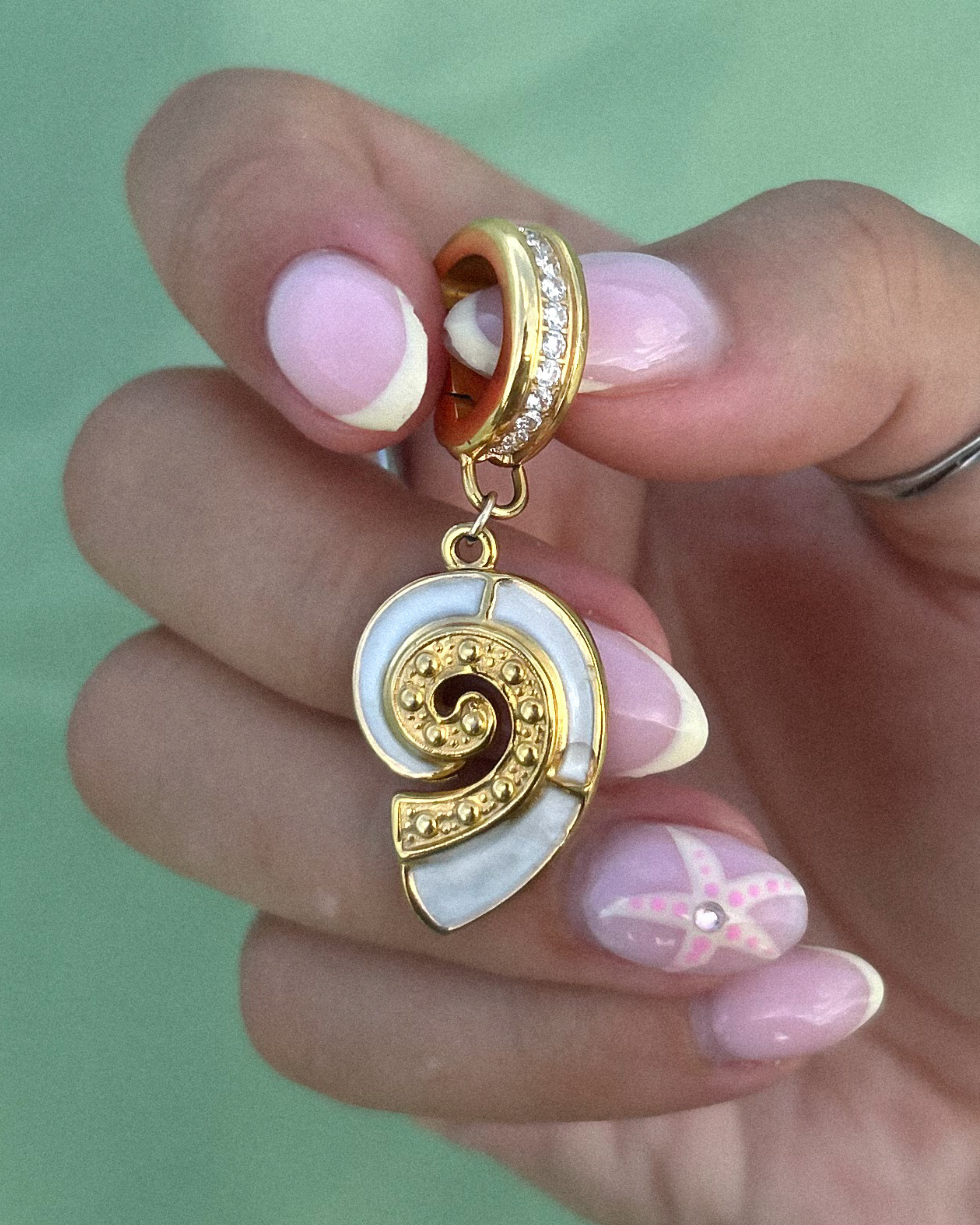 Coastal | Channel dreamy beach days with our Coastal Swimwear Charm. Featuring a swirling seashell design with shimmering white enamel inlays and pavé details on the hoop, this piece captures the essence of the shore.